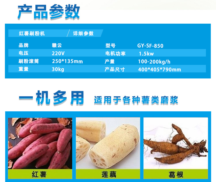 紅薯刷粉機(jī)適用于加工番薯/紅薯、木薯、馬鈴薯、蕉藕、芋頭及其它塊根作物的磨碎作業(yè),加工成粉。適用于山區(qū)、半山區(qū)的糧食加工廠及普通用戶。可配用220V的1.5KW電機(jī)使用,也可配用柴油機(jī),目前價(jià)格配的是國(guó)標(biāo)銅線電機(jī)!