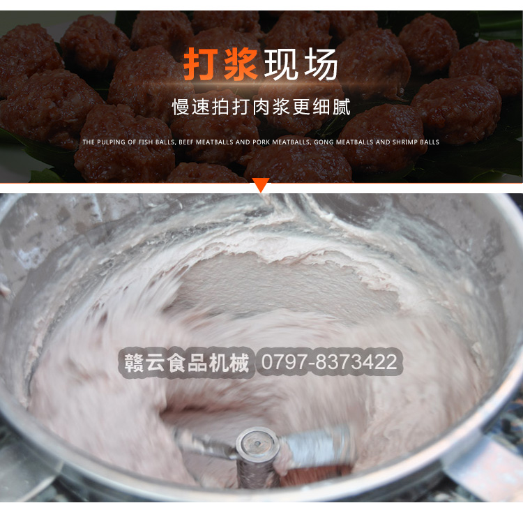 贛云牌全不銹鋼慢速魚丸、肉丸打漿機采用優(yōu)質不銹鋼材質,通過大皮帶輪減速帶動打漿機刀片打漿,通過慢速拍打,使肉漿更具有彈性和韌性。適合魚丸、牛肉丸和貢丸的制漿之用。