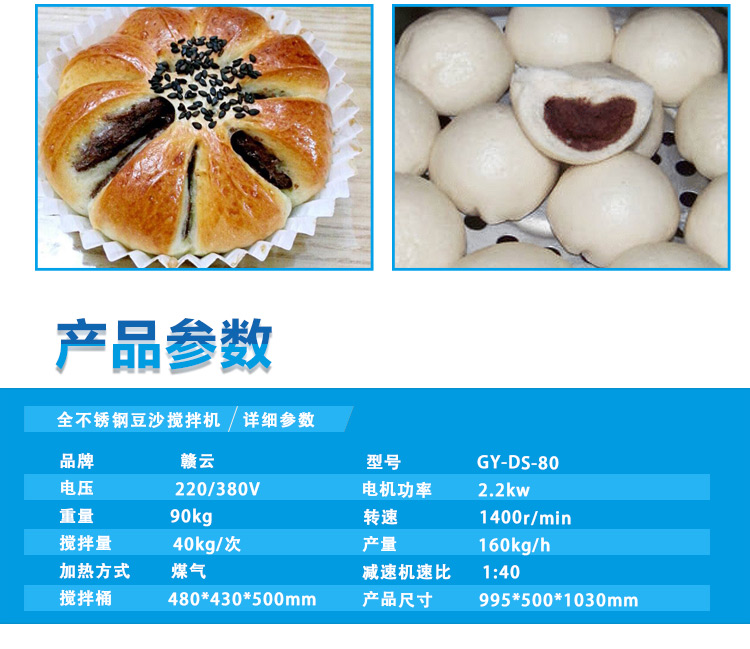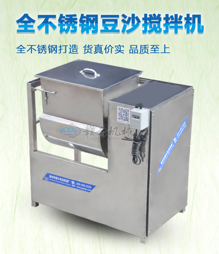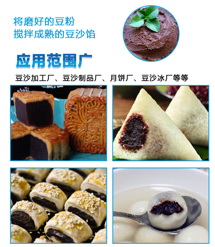 本豆沙機(jī)將磨好的豆粉攪拌成熟的豆沙餡,可運用于豆沙加工廠,豆沙制品廠,月餅廠,豆沙冰廠等等。本豆沙機(jī)分為煤氣加熱、電加熱2種類型 產(chǎn)量:160KG/小時。