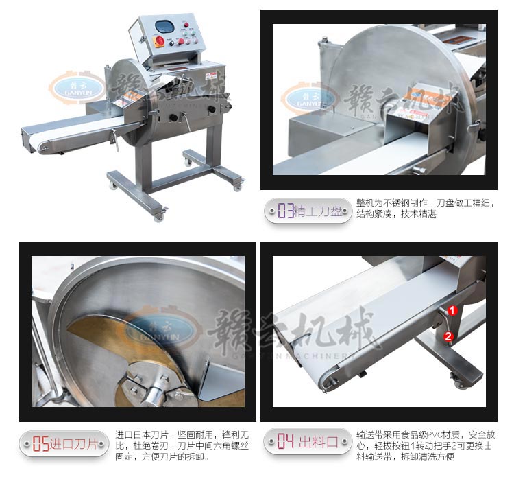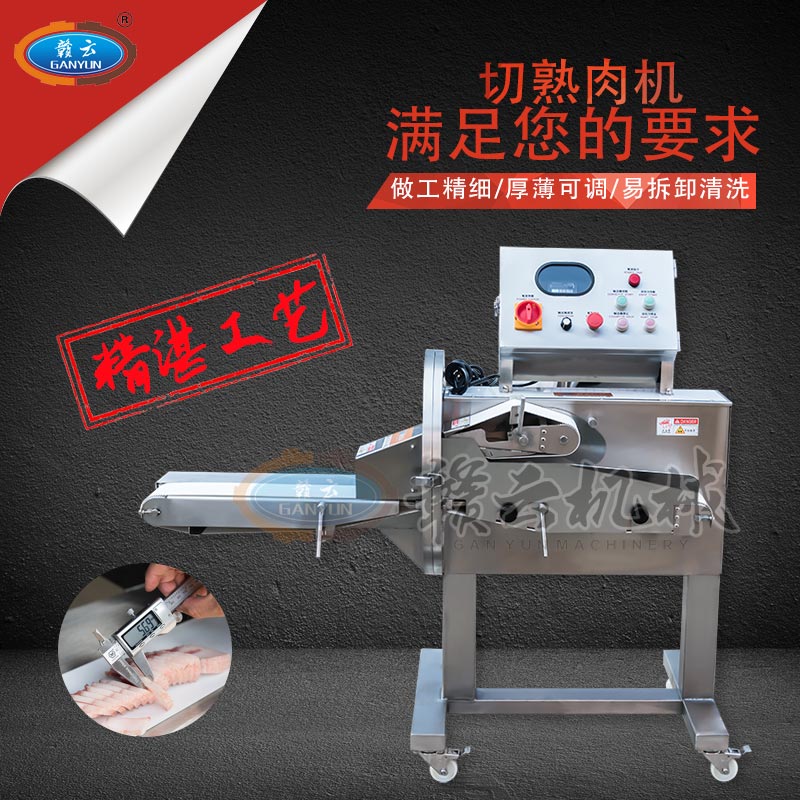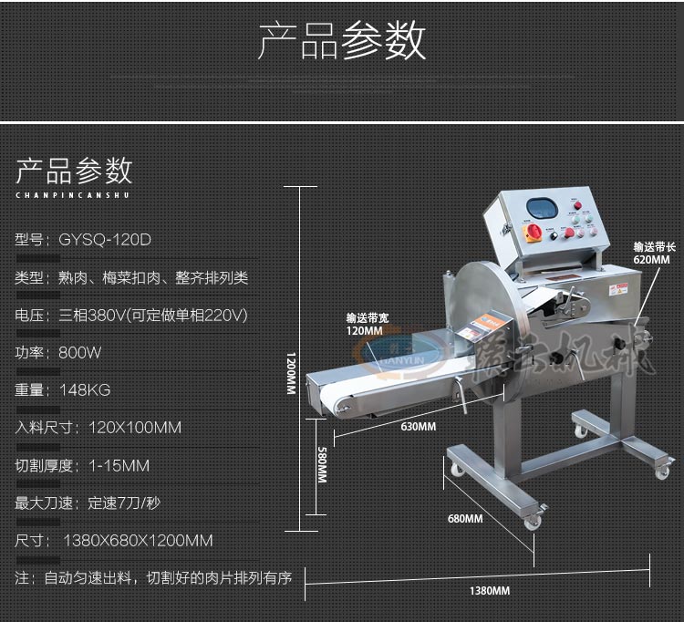 GYSQ-120D切熟肉機,專業(yè)切熟肉機可切扣肉、鹵豬耳朵、五花肉等,通過調(diào)整輸送帶的速度控制切割厚度,輸送帶越快厚度越厚,越慢越薄。適用于食堂、中央廚房、餐飲配送中心、肉聯(lián)廠、大型酒店等。變頻電控箱,通過調(diào)節(jié)輸送帶速度控制切割厚度,按鍵防水設(shè)計,可拆卸輸送帶。優(yōu)質(zhì)刀片,杜絕卷刃。