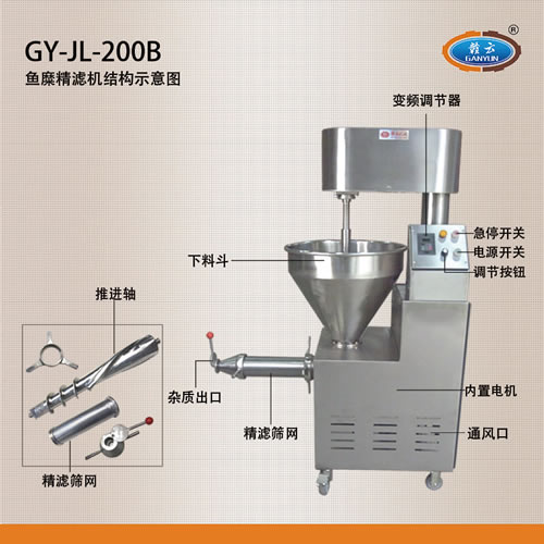 魚糜魚肉精濾機,商用變頻自動化過濾魚肉魚刺魚骨機,魚肉雜質過濾機可對魚肉采肉機采出來的肉進行進一步精濾,去除殘余魚鱗,魚筋,魚皮,魚血等雜質,在加工高端魚丸、魚豆腐、魚餅這些對肉質要求高的魚類制品,需要經過此款精濾機再過濾,是魚糜加工生產設備。 先經過采肉機將采好的魚肉,在經由進料口進入精濾機中,通過絞龍的攪動輸送和擠壓工作,把純魚肉從細小的過濾篩網小孔內擠出,魚肉中所含的少量雜質因大于篩網小孔,故殘留在篩網內被絞龍輸送至另外一端出料口中排出,完成魚肉和雜質的分離作用