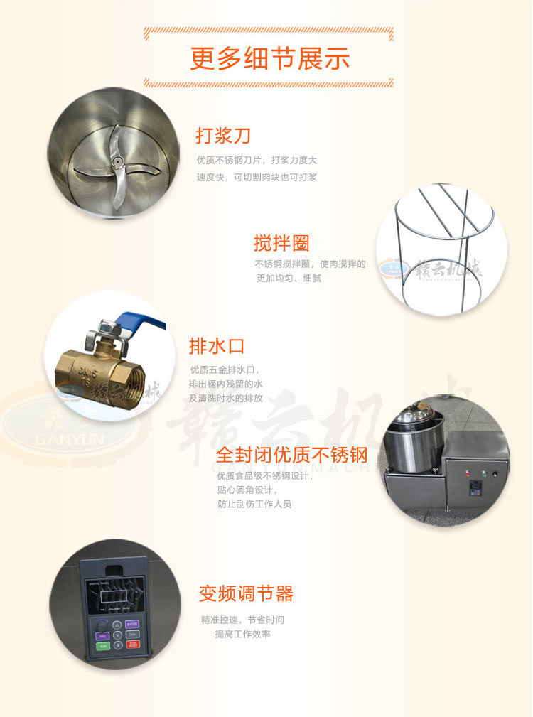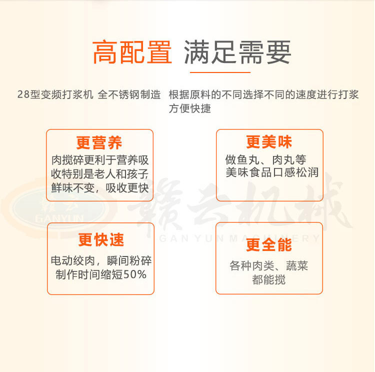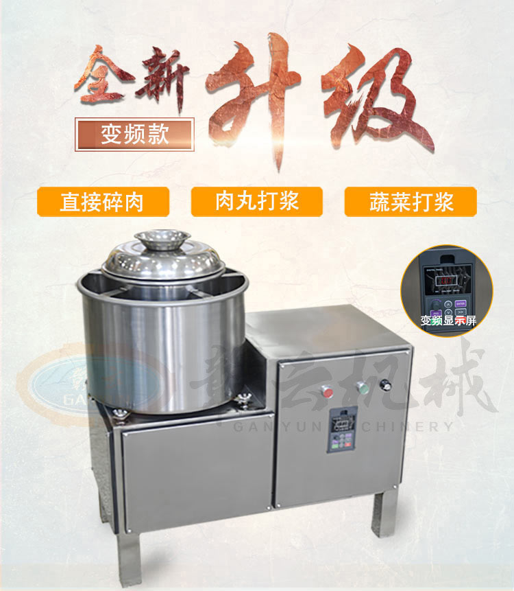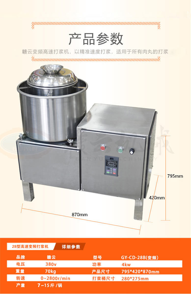 28型變頻傳動打漿機,全封閉不銹鋼設計更好的保護電機,可打7-15斤每鍋,適合肉丸魚丸加工作坊加工生產。