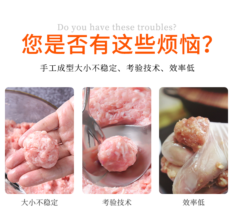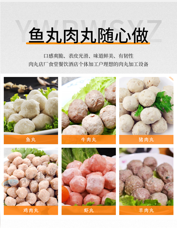肉丸機用于加工:豬肉丸、魚丸、牛肉丸、素丸、雞肉丸、寧都肉丸、蝦丸、羊肉丸等肉丸食品,適用于肉丸店、飯店、食堂、肉制品加工廠等多種場所。