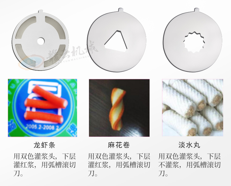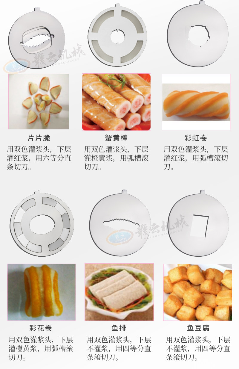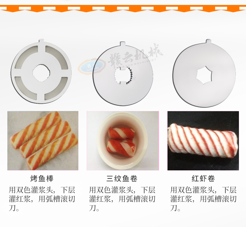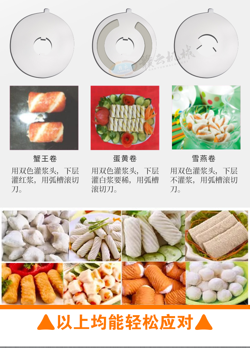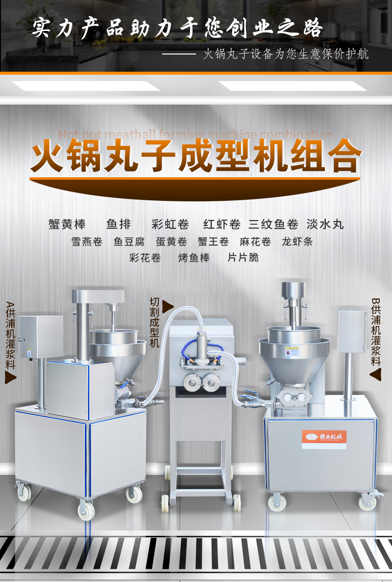 適用于:蟹黃棒、魚排、彩虹卷、紅蝦卷、三紋魚卷、淡水丸、雪燕卷、魚豆腐、蛋黃卷、蟹王卷、麻花卷、龍蝦條、彩花卷、烤魚棒、片片脆等多種火鍋丸子的加工生產。