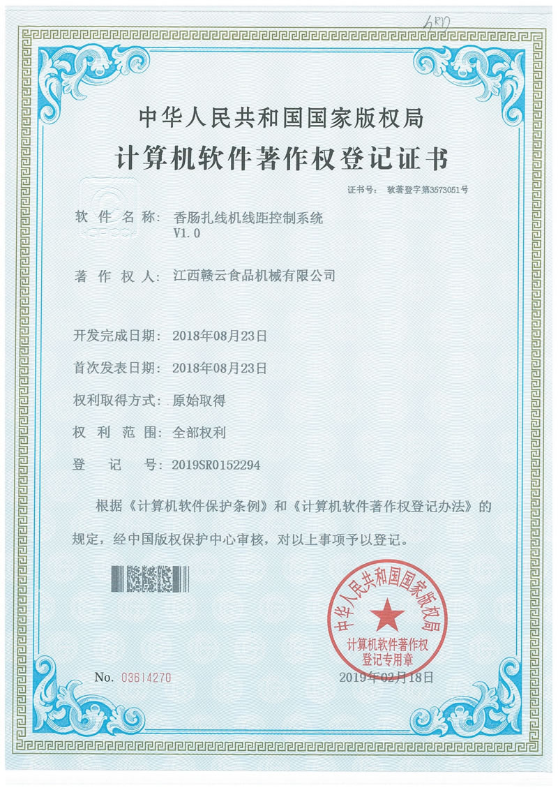 計算機軟件著作權登記證書(香腸扎線機線距控制系統(tǒng))