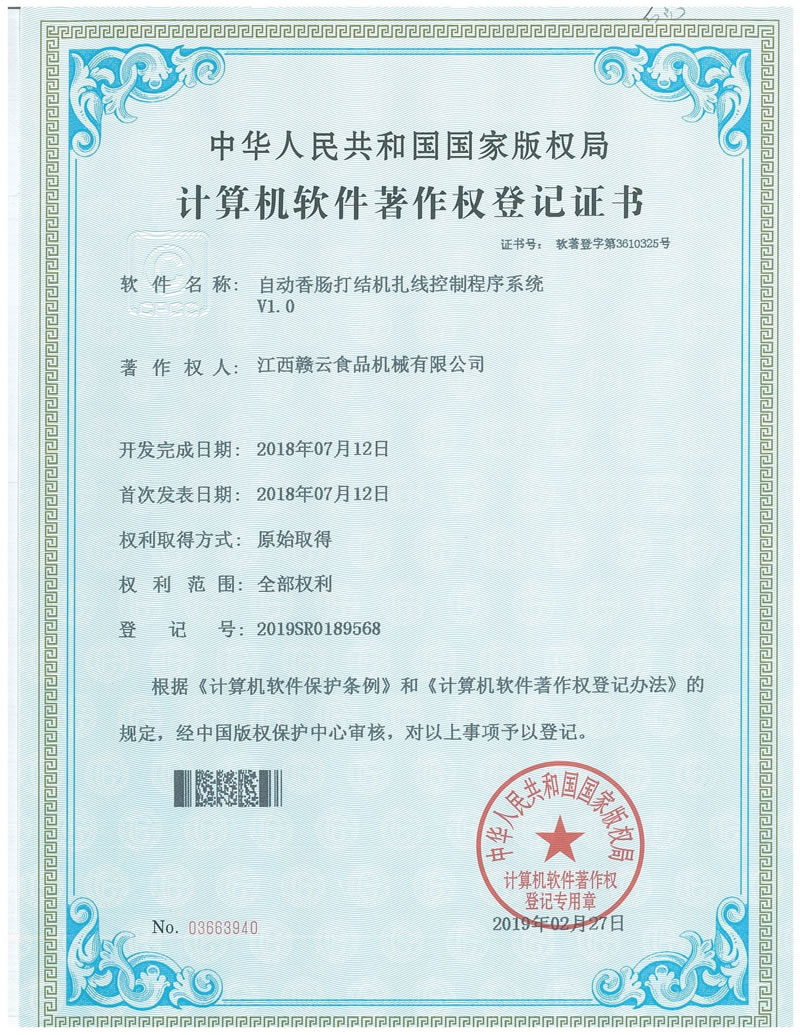 計(jì)算機(jī)軟件著作權(quán)登記證書(shū)(自動(dòng)香腸打結(jié)機(jī)扎線控制程序系統(tǒng))