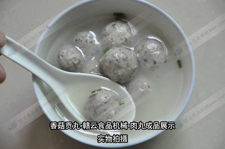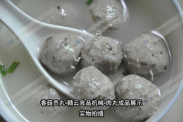 贛云食品機械肉丸成套設(shè)備的結(jié)晶,香菇貢丸,合作客戶獨家配方,用贛云牌肉丸設(shè)備制作的香菇貢丸,味美,有嚼勁,香菇原味,保證您吃了還想吃。香菇貢丸所需設(shè)備:自動絞肉機一臺,高速打漿機一臺,慢速打漿機一臺,食物切碎機一臺,貢丸機一臺,自動煮丸水槽一臺即可現(xiàn)做現(xiàn)賣,也可接單定做。相關(guān)設(shè)備的工作內(nèi)容:自動絞肉機碎肉,高速打漿機將肉粒快速打成肉漿,慢速打漿機將肉漿調(diào)味,食物切碎機將香菇切成細小顆粒,放入慢速漿機中和肉漿一起調(diào)勻入味,貢丸機將肉漿成型貢丸,自動煮丸水槽將成型后的肉丸初步定型。批量的香菇貢丸就是這樣制作而成。