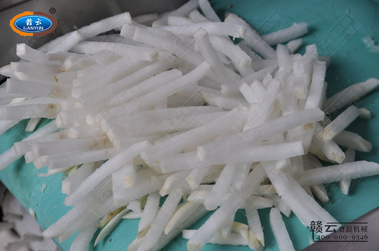 贛州市贛云食品機械廠專業(yè)生產(chǎn)銷售切菜機、切丁機、切條機、切片機等多功能系列切菜設備,山東客戶定做1000B型切菜機切蘿卜條,定做8mm切條刀具試機效果展示圖片賞析,菜場購買的大白蘿卜,最大直徑約90mm,切出來的蘿卜條規(guī)格為8*8*90mm,以下是本次試機實際效果圖片賞析: