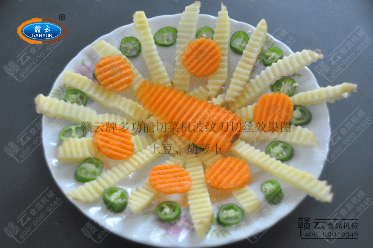 贛云牌多功能切菜機(jī)安裝波紋型刀具切出波浪形效果。以胡蘿卜和土豆為例,經(jīng)過離心切片后切波浪型效果展示圖: