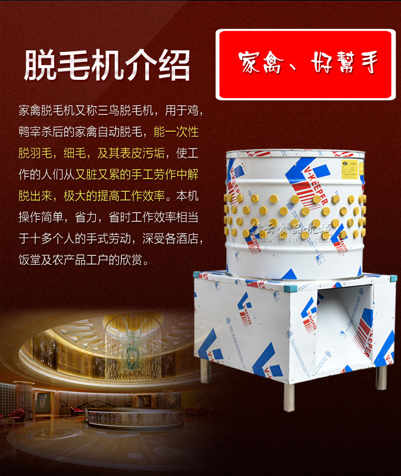 燒鴨自古以來就是很美味的一道菜,聰明的古代人在吃方面也有所研究,燒鴨這道美味的菜肴就是聰明的古代人的研究成果,很久以前在嶺南地區(qū)就流傳著這樣一句話:廣州吃燒鵝,南寧吃燒鴨。南寧人自古喜歡吃鴨,這和南寧的氣候有極大關系。南寧天氣炎熱,居住于此的南寧先民認為鴨肉清熱祛火,而鵝肉性毒,吃了會使患處愈加發(fā)炎腫脹,多食上火生瘡。據(jù)說,南寧最早出現(xiàn)燒鴨是在清初康熙年間。南寧燒鴨的原料多選用南寧本地的芝麻鴨,皮香肉嫩,骨頭帶香。由于地域不同,形成了選料、制作流程、吃法等風格的迥異,南寧燒鴨與北京烤鴨代表了中國烤鴨的南北兩派別,但是鴨子固然好吃,但是鴨毛缺很難處理,現(xiàn)在由小編為為您推薦一款現(xiàn)在食品加工中最為受歡迎的一款雞鴨鵝脫毛機器, 為您解決雞鴨鵝脫脫毛的問題。贛云牌家禽全自動脫毛機可供廣大禽加工專業(yè)戶,烤雞、烤鴨、飯店、餐館、學校、食堂、酒店、菜場等使用,操作過程中具有操作簡單,省力、省時,衛(wèi)生等優(yōu)點,推薦的這款脫雞鴨毛的機器外觀選用了全不銹鋼結構,內置脫毛棒,這款全自動家禽褪毛機脫出的家禽都非常的干凈,脫凈率高達了98%,我們更是專業(yè)生產(chǎn)加工廠雞鴨脫毛機的,所以選擇我們贛云將是您不錯的選擇。